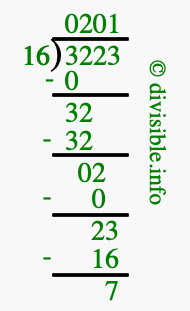 The image displays 201 at the top, which is the quotient, and 7 at the bottom, which is the remainder. Therefore, the answer to 3223 divided by 16 (3223 ÷ 16) using long division is 201 remainder 7, or simply 201 R 7.