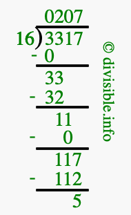 The image displays 207 at the top, which is the quotient, and 5 at the bottom, which is the remainder. Therefore, the answer to 3317 divided by 16 (3317 ÷ 16) using long division is 207 remainder 5, or simply 207 R 5.