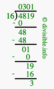 The image displays 301 at the top, which is the quotient, and 3 at the bottom, which is the remainder. Therefore, the answer to 4819 divided by 16 (4819 ÷ 16) using long division is 301 remainder 3, or simply 301 R 3.