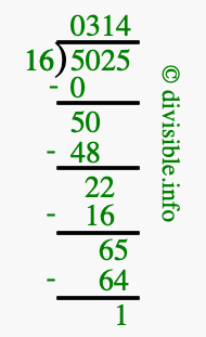 The image displays 314 at the top, which is the quotient, and 1 at the bottom, which is the remainder. Therefore, the answer to 5025 divided by 16 (5025 ÷ 16) using long division is 314 remainder 1, or simply 314 R 1.