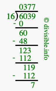 The image displays 377 at the top, which is the quotient, and 7 at the bottom, which is the remainder. Therefore, the answer to 6039 divided by 16 (6039 ÷ 16) using long division is 377 remainder 7, or simply 377 R 7.