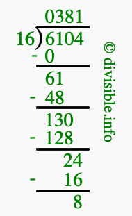 The image displays 381 at the top, which is the quotient, and 8 at the bottom, which is the remainder. Therefore, the answer to 6104 divided by 16 (6104 ÷ 16) using long division is 381 remainder 8, or simply 381 R 8.