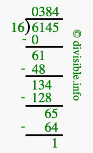 The image displays 384 at the top, which is the quotient, and 1 at the bottom, which is the remainder. Therefore, the answer to 6145 divided by 16 (6145 ÷ 16) using long division is 384 remainder 1, or simply 384 R 1.