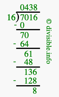 Here we will show you an image that illustrates how to calculate 7016 divided by 16 using long division. We will also give you the answer to 7016 divided by 16 (7016 ÷ 16) as a fraction and as a decimal.