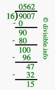 Here we will show you an image that illustrates how to calculate 9007 divided by 16 using long division. We will also give you the answer to 9007 divided by 16 (9007 ÷ 16) as a fraction and as a decimal.