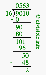 The image displays 563 at the top, which is the quotient, and 2 at the bottom, which is the remainder. Therefore, the answer to 9010 divided by 16 (9010 ÷ 16) using long division is 563 remainder 2, or simply 563 R 2.