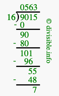 The image displays 563 at the top, which is the quotient, and 7 at the bottom, which is the remainder. Therefore, the answer to 9015 divided by 16 (9015 ÷ 16) using long division is 563 remainder 7, or simply 563 R 7.