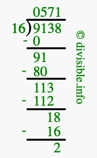 The image displays 571 at the top, which is the quotient, and 2 at the bottom, which is the remainder. Therefore, the answer to 9138 divided by 16 (9138 ÷ 16) using long division is 571 remainder 2, or simply 571 R 2.