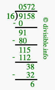 The image displays 572 at the top, which is the quotient, and 6 at the bottom, which is the remainder. Therefore, the answer to 9158 divided by 16 (9158 ÷ 16) using long division is 572 remainder 6, or simply 572 R 6.