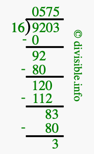 Here we will show you an image that illustrates how to calculate 9203 divided by 16 using long division. We will also give you the answer to 9203 divided by 16 (9203 ÷ 16) as a fraction and as a decimal.