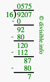 The image displays 575 at the top, which is the quotient, and 7 at the bottom, which is the remainder. Therefore, the answer to 9207 divided by 16 (9207 ÷ 16) using long division is 575 remainder 7, or simply 575 R 7.
