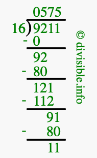 The image displays 575 at the top, which is the quotient, and 11 at the bottom, which is the remainder. Therefore, the answer to 9211 divided by 16 (9211 ÷ 16) using long division is 575 remainder 11, or simply 575 R 11.