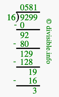 The image displays 581 at the top, which is the quotient, and 3 at the bottom, which is the remainder. Therefore, the answer to 9299 divided by 16 (9299 ÷ 16) using long division is 581 remainder 3, or simply 581 R 3.