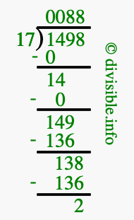 The image displays 88 at the top, which is the quotient, and 2 at the bottom, which is the remainder. Therefore, the answer to 1498 divided by 17 (1498 ÷ 17) using long division is 88 remainder 2, or simply 88 R 2.