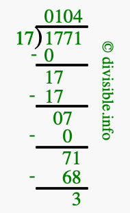 Here we will show you an image that illustrates how to calculate 1771 divided by 17 using long division. We will also give you the answer to 1771 divided by 17 (1771 ÷ 17) as a fraction and as a decimal.
