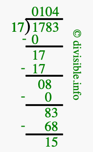 The image displays 104 at the top, which is the quotient, and 15 at the bottom, which is the remainder. Therefore, the answer to 1783 divided by 17 (1783 ÷ 17) using long division is 104 remainder 15, or simply 104 R 15.
