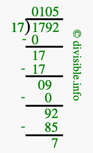 The image displays 105 at the top, which is the quotient, and 7 at the bottom, which is the remainder. Therefore, the answer to 1792 divided by 17 (1792 ÷ 17) using long division is 105 remainder 7, or simply 105 R 7.