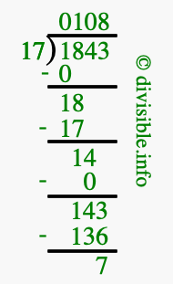 Here we will show you an image that illustrates how to calculate 1843 divided by 17 using long division. We will also give you the answer to 1843 divided by 17 (1843 ÷ 17) as a fraction and as a decimal.