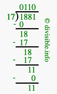 The image displays 110 at the top, which is the quotient, and 11 at the bottom, which is the remainder. Therefore, the answer to 1881 divided by 17 (1881 ÷ 17) using long division is 110 remainder 11, or simply 110 R 11.