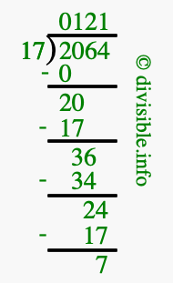 The image displays 121 at the top, which is the quotient, and 7 at the bottom, which is the remainder. Therefore, the answer to 2064 divided by 17 (2064 ÷ 17) using long division is 121 remainder 7, or simply 121 R 7.