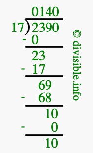 Here we will show you an image that illustrates how to calculate 2390 divided by 17 using long division. We will also give you the answer to 2390 divided by 17 (2390 ÷ 17) as a fraction and as a decimal.