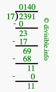 The image displays 140 at the top, which is the quotient, and 11 at the bottom, which is the remainder. Therefore, the answer to 2391 divided by 17 (2391 ÷ 17) using long division is 140 remainder 11, or simply 140 R 11.