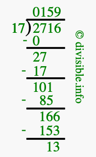 The image displays 159 at the top, which is the quotient, and 13 at the bottom, which is the remainder. Therefore, the answer to 2716 divided by 17 (2716 ÷ 17) using long division is 159 remainder 13, or simply 159 R 13.