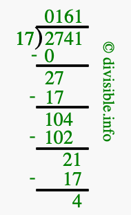 The image displays 161 at the top, which is the quotient, and 4 at the bottom, which is the remainder. Therefore, the answer to 2741 divided by 17 (2741 ÷ 17) using long division is 161 remainder 4, or simply 161 R 4.