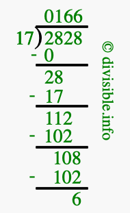 The image displays 166 at the top, which is the quotient, and 6 at the bottom, which is the remainder. Therefore, the answer to 2828 divided by 17 (2828 ÷ 17) using long division is 166 remainder 6, or simply 166 R 6.