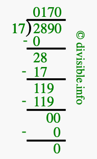 Here we will show you an image that illustrates how to calculate 2890 divided by 17 using long division. We will also give you the answer to 2890 divided by 17 (2890 ÷ 17) as a fraction and as a decimal.