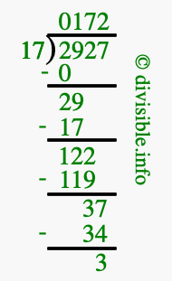 Here we will show you an image that illustrates how to calculate 2927 divided by 17 using long division. We will also give you the answer to 2927 divided by 17 (2927 ÷ 17) as a fraction and as a decimal.