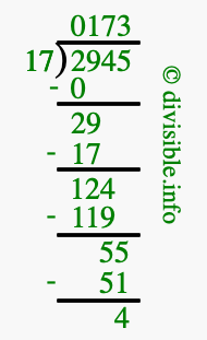 Here we will show you an image that illustrates how to calculate 2945 divided by 17 using long division. We will also give you the answer to 2945 divided by 17 (2945 ÷ 17) as a fraction and as a decimal.