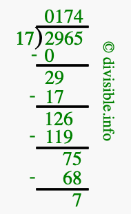 The image displays 174 at the top, which is the quotient, and 7 at the bottom, which is the remainder. Therefore, the answer to 2965 divided by 17 (2965 ÷ 17) using long division is 174 remainder 7, or simply 174 R 7.