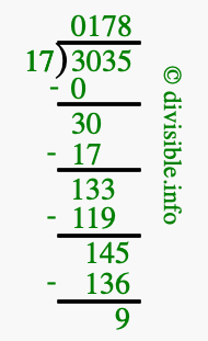 The image displays 178 at the top, which is the quotient, and 9 at the bottom, which is the remainder. Therefore, the answer to 3035 divided by 17 (3035 ÷ 17) using long division is 178 remainder 9, or simply 178 R 9.