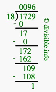 The image displays 96 at the top, which is the quotient, and 1 at the bottom, which is the remainder. Therefore, the answer to 1729 divided by 18 (1729 ÷ 18) using long division is 96 remainder 1, or simply 96 R 1.