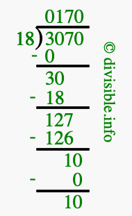 The image displays 170 at the top, which is the quotient, and 10 at the bottom, which is the remainder. Therefore, the answer to 3070 divided by 18 (3070 ÷ 18) using long division is 170 remainder 10, or simply 170 R 10.