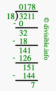 The image displays 178 at the top, which is the quotient, and 7 at the bottom, which is the remainder. Therefore, the answer to 3211 divided by 18 (3211 ÷ 18) using long division is 178 remainder 7, or simply 178 R 7.