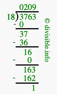 The image displays 209 at the top, which is the quotient, and 1 at the bottom, which is the remainder. Therefore, the answer to 3763 divided by 18 (3763 ÷ 18) using long division is 209 remainder 1, or simply 209 R 1.