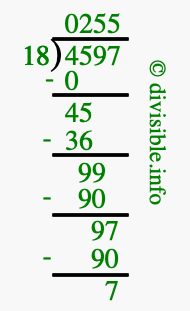 The image displays 255 at the top, which is the quotient, and 7 at the bottom, which is the remainder. Therefore, the answer to 4597 divided by 18 (4597 ÷ 18) using long division is 255 remainder 7, or simply 255 R 7.