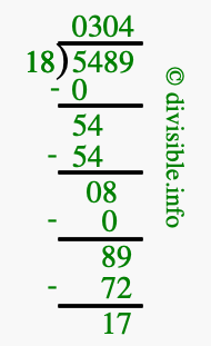 The image displays 304 at the top, which is the quotient, and 17 at the bottom, which is the remainder. Therefore, the answer to 5489 divided by 18 (5489 ÷ 18) using long division is 304 remainder 17, or simply 304 R 17.