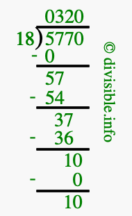 The image displays 320 at the top, which is the quotient, and 10 at the bottom, which is the remainder. Therefore, the answer to 5770 divided by 18 (5770 ÷ 18) using long division is 320 remainder 10, or simply 320 R 10.