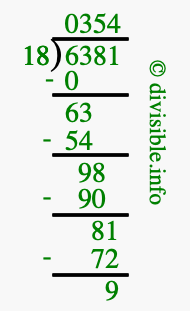 The image displays 354 at the top, which is the quotient, and 9 at the bottom, which is the remainder. Therefore, the answer to 6381 divided by 18 (6381 ÷ 18) using long division is 354 remainder 9, or simply 354 R 9.
