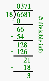 The image displays 371 at the top, which is the quotient, and 3 at the bottom, which is the remainder. Therefore, the answer to 6681 divided by 18 (6681 ÷ 18) using long division is 371 remainder 3, or simply 371 R 3.