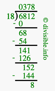 The image displays 378 at the top, which is the quotient, and 8 at the bottom, which is the remainder. Therefore, the answer to 6812 divided by 18 (6812 ÷ 18) using long division is 378 remainder 8, or simply 378 R 8.
