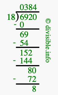 The image displays 384 at the top, which is the quotient, and 8 at the bottom, which is the remainder. Therefore, the answer to 6920 divided by 18 (6920 ÷ 18) using long division is 384 remainder 8, or simply 384 R 8.