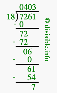 The image displays 403 at the top, which is the quotient, and 7 at the bottom, which is the remainder. Therefore, the answer to 7261 divided by 18 (7261 ÷ 18) using long division is 403 remainder 7, or simply 403 R 7.