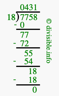 The image displays 431 at the top, which is the quotient, and 0 at the bottom, which is the remainder. Therefore, the answer to 7758 divided by 18 (7758 ÷ 18) using long division is 431 remainder 0, or simply 431 R 0.