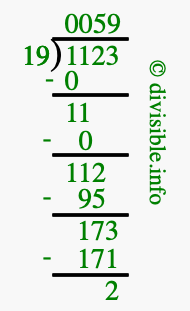 The image displays 59 at the top, which is the quotient, and 2 at the bottom, which is the remainder. Therefore, the answer to 1123 divided by 19 (1123 ÷ 19) using long division is 59 remainder 2, or simply 59 R 2.