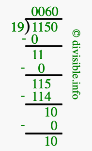 Here we will show you an image that illustrates how to calculate 1150 divided by 19 using long division. We will also give you the answer to 1150 divided by 19 (1150 ÷ 19) as a fraction and as a decimal.