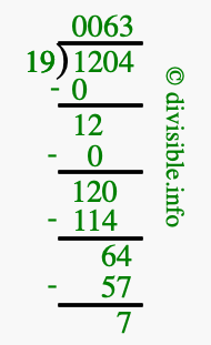 The image displays 63 at the top, which is the quotient, and 7 at the bottom, which is the remainder. Therefore, the answer to 1204 divided by 19 (1204 ÷ 19) using long division is 63 remainder 7, or simply 63 R 7.
